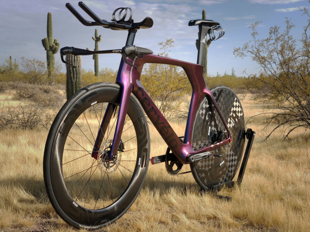 Phoenix, AZ resident and Chris McDonald Big Sexy Racing athlete Ben Miller has owned several Cervelo bikes and among them a P2, P3, P4, P5six and most recently a P5X, and he now added a super light P5 Disc to his quiver. Not content with the standard frame paint scheme, and the Sunweb team color apparently not available for mere mortals, Miller had the frame set custom painted Nissan GT-R R34 Midnight Purple iii (from a 1999 Nissan GT-R R34 which shifts color depending on the light) and went to town to trick it out. That 58cm super bike weighs a scant 18.04 pounds and Miller is apparently not yet done in terms of tricking it out. But he is thrilled with the bike as is.