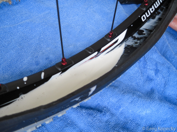 You’ll notice in the photo above that the sealant looks like glue – and that’s exactly what you need to seal up the imperfect tire bead against the rim. Sealant shores up micro gaps in these surfaces, while allowing the tire bead and casing to be lighter in weight. For comparison, there is a mostly-defunct mountain bike tubeless standard called UST, which doesn’t require the use of sealant for an air-tight fit, due to a heavy tire bead, heavy sidewalls, and very strict tolerances for both tire and rim. (All the extra weight led to its abandonment, despite its function). There is a new road UST, which does require sealant.