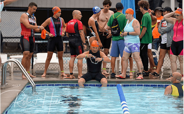 I saw a friend of mine who owns a tree service drive his bucket truck past my office window. Could I get him to hang a huge American flag over the pool off a bucket truck, and take the other truck to hang a large welcome banner over the transition area and finish line? Of course the answer was yes and the results were memorable.