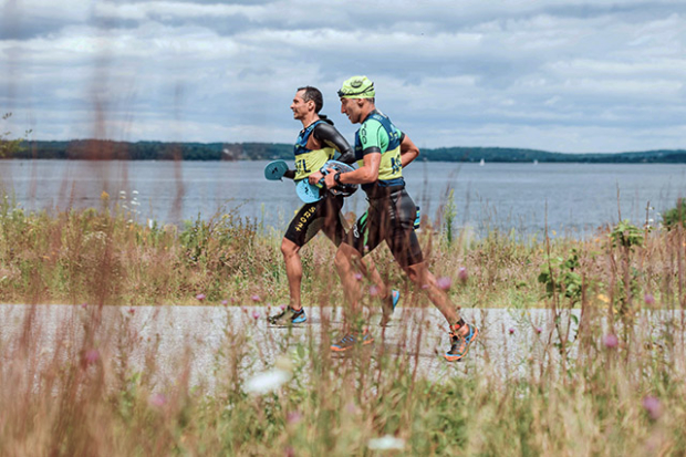 Slowtwitchers Patrik Rung and Therese Nasman from Team Motvind traverse Vaill Island.