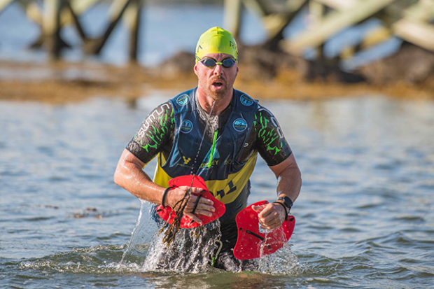 Racer exits the swim from Little Island and runs onto Little Diamond Island.