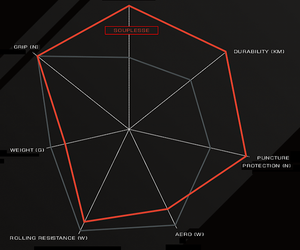 The grey shape (heptagram?) is the current tire, the red is the new tire, and as you see the new Pro Ones are more durable, more puncture resistant, and when you see that the tire is “less” it’s less in a good way: less weight, less drag, less rolling resistance.