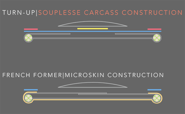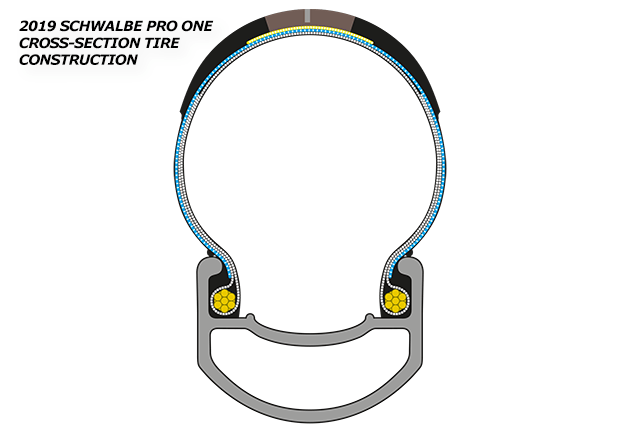 The major changes in the new Pro One versus the old are in shape, diameter, materials and construction concept. The turn-up scheme is different, as you can see. There are 2 layers of carcass instead of 4. The breaker (puncture layer) is 40mm wide. The “compound” (think Black Chile) has changed. It’s called Addix.