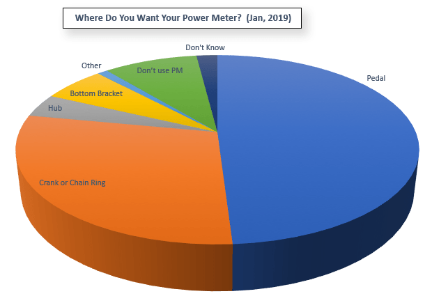 I asked the very same question 8 months ago, and got a pretty similar answer out of the 1,250 of you who answered: 49 percent wanted the power meter in the pedal, and only 12 percent were non-PM users, etc., which means 56 percent of you wanted pedals that had the PM inside of it.