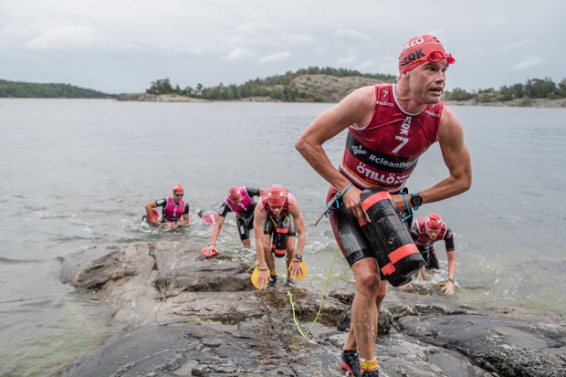 The men's race was very tight and here Pontus Lindberg of Team ATG Sport is seen leading team mate George Bjälkemo, the defending champions Fredrik Axegård and Alex Flores of Team ARK Swimrun and Lars Ekman and Jonas Ekman Fischer of the Sailfish team Bröderna Bäver out of the water late in the race.
