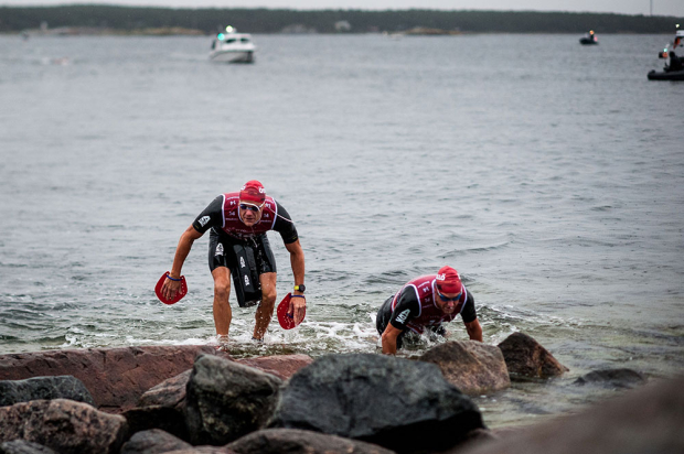 Sliding on the butt into the water for the next swim section is possibly not the most graceful way to enter the water, but it surely beats slipping and injuring yourself. Anneli Wall and Jenny Ramstedt of team HEAD Swimming are experienced Swimrun athletes, and they finished the race in 10:15:49. That was 51st place overall and 10th place in the female division.