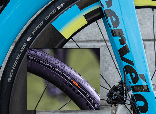 The Vanquish is HED’s newest aero wheel and like most wheel brands on the leading edge of tech, these wheels are 60mm deep and are configured tubeless. The tires on this bike are tubeless Schwalbe Pro Ones. Yes, we’ve been talking about these lately. There’s a thread on our Reader Forum asking where to buy the new Pro Ones. I’ve inset the new Pro One, so you can see the difference in graphic treatment. Sika’s bike doesn’t yet have the new Pro Ones but they’ll be on her bike within a week or so. If the Pro Ones you get don’t have the orange logo, they’re the old Pro Ones.