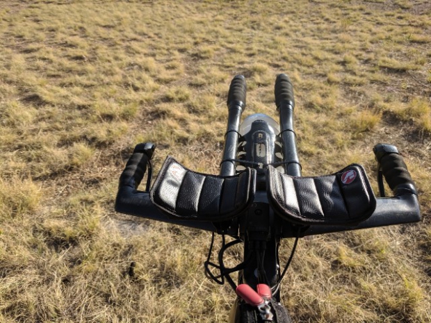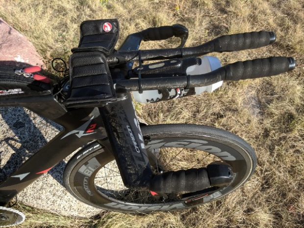 Two of the adaptions Peterson made to his bike from his pro cycling time-trial setup included extending his aero extensions to the max and moved his arm rests wider.