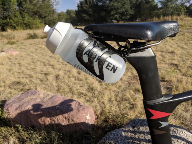 An XLAB Gorilla carbon cage is zip tied to secure a bottle behind his fi'zi:k Mistica saddle.