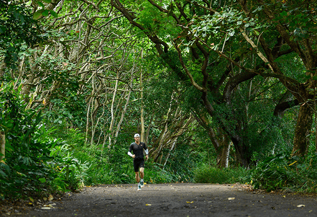 I already ran it the day before, but not all of it. In fact, not half of it. Time and leg constraints restricted me to a downhill from the Waipio Valley lookout—the official start—a valley crossing, and one uphill on the other side of the valley (you can see a little of what it looks like above). This all took me 90 minutes, what with getting lost, calculating where to negotiate a river crossing and the like.