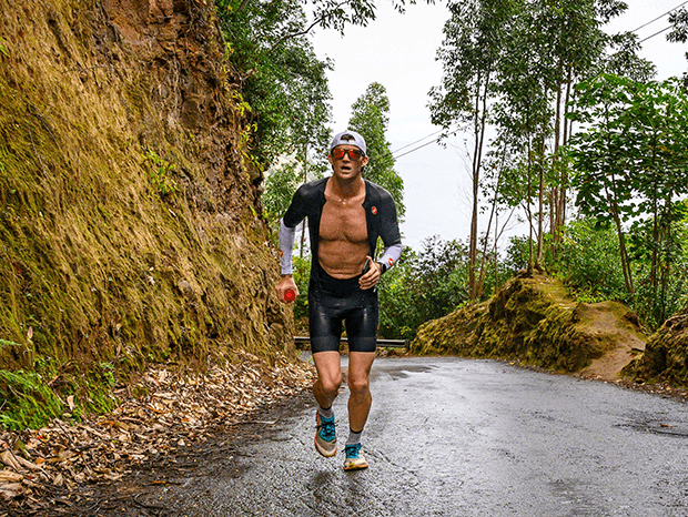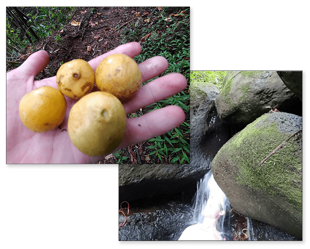 Then it's up and down, between 1,000 and 1,500 feet, and remember it's Hawaii. It's hot and humid. Lars texted me after it was over. "Insane! Ran out of water and electrolytes, cramped really badly, so resorted to these little fruits and the stream falls." Don't know what those fruits are. You can see Ghost of Lars in the stream image.