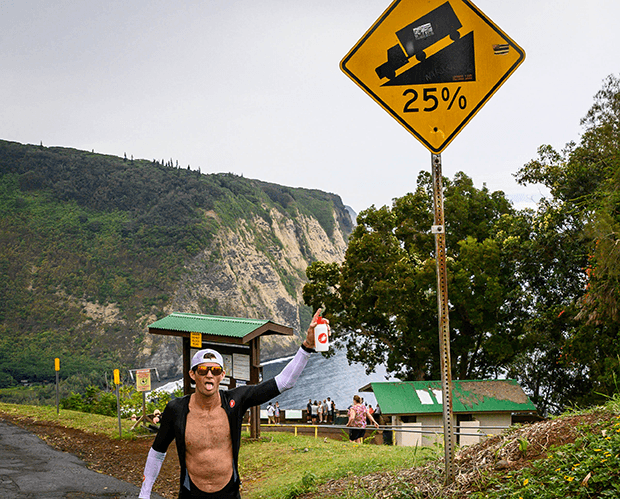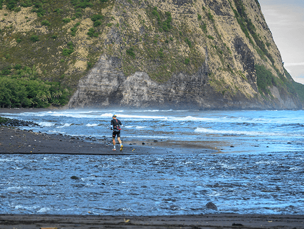 This run is 19 miles long, with ridiculous climbing and descending. You start at the Waipio Lookout, about a thousand feet above the sea. The run down to the valley is paved, barely, is one lane, and it averages about 22 percent with pitches near or over 30 percent. It's maybe two-thirds of a mile long. My quads were toast when I got to the bottom.