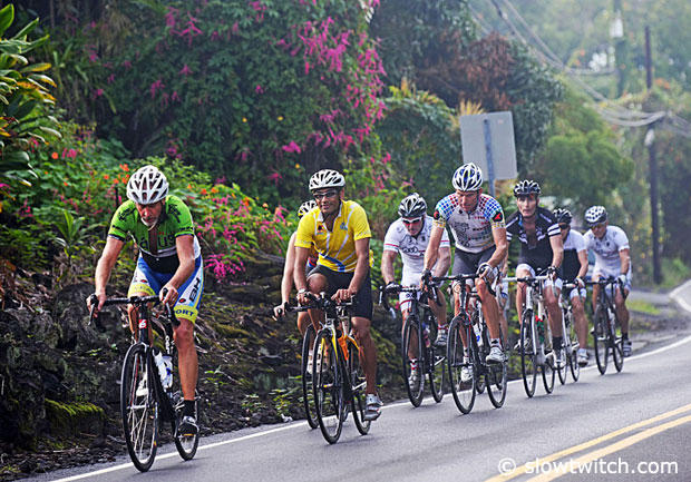 This year I went there. I and our man Lars Finanger. This image above is of the Z Trail. We'll get to that. But first, one of the groups who explore this part of the island is the ENVE crowd, hard core cyclists whose rides intimidate me. Below they're getting ready to head from Hawi (Ironman's bike course turnaround) to Waimea, which begins with a 3,000 foot climb.