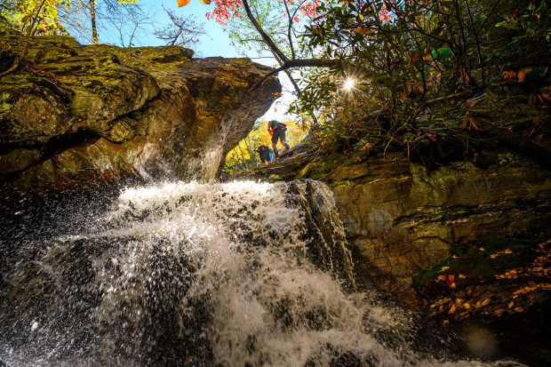 Higher up in Cascade Falls, Derek Tingle and Jennifer Gerard from TN are focused on the task at hand, and followed closely by a Swedish female team.