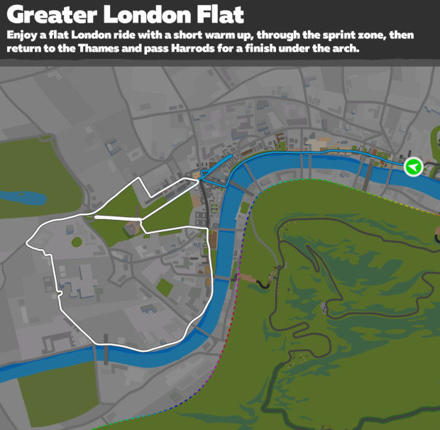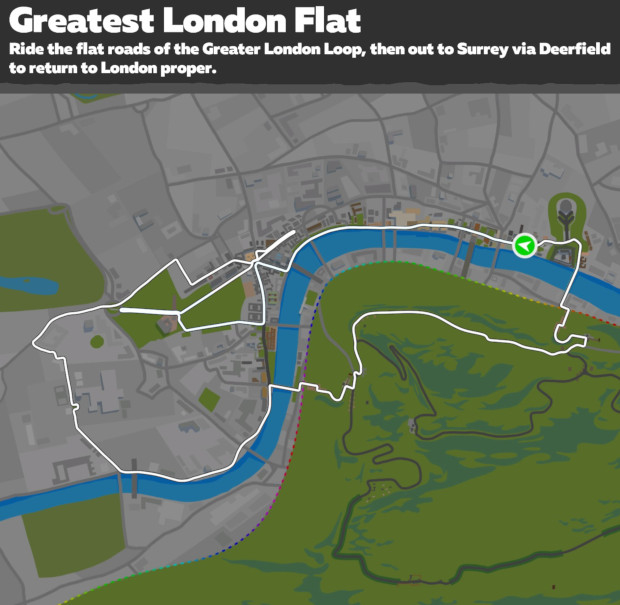 As the name implies, this is the basically tied with the Classique as the flattest London route, with only 173 feet of elevation gain over 7.3 miles. Like the Classique, this one has a longer lead-in than you might expect, so plan for a longer ride than what Zwift tells you.