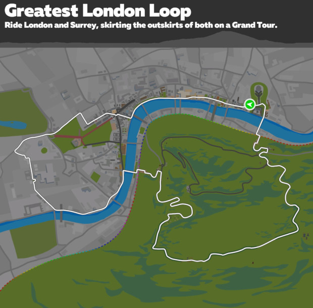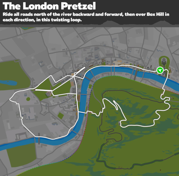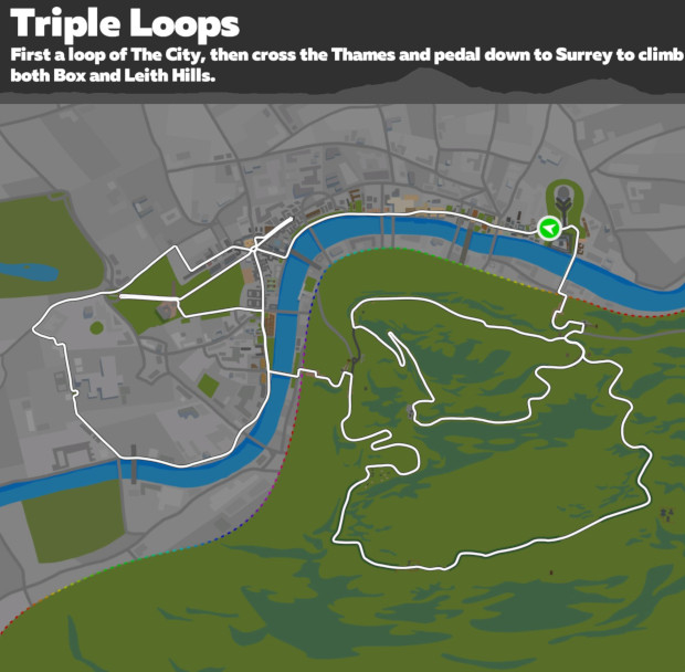 With a minimal lead-in, this route takes you on a figure 8 through London and then up Box Hill.