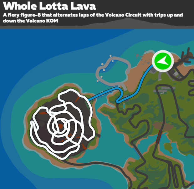 The Volcano Flat route takes you through the classic areas of Watopia, staying on a relatively flat course through the ocean tunnel, the Italian Villas, and through part of the volcano before returning to the start. Other than a couple of gentle hills, this one is pretty much staying near sea level the entire time.