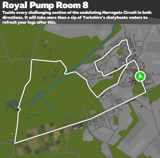 The Royal Pump Room 8 utilizes the entire UCI Worlds circuit, but in a figure 8 configuration allowing you to cover the entire route in both directions, and effectively doubling the distance of the UCI Worlds circuit. This is currently the longest route in the Yorkshire world.
