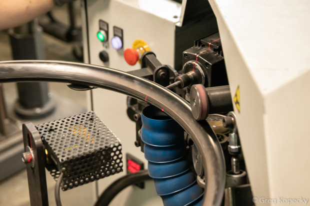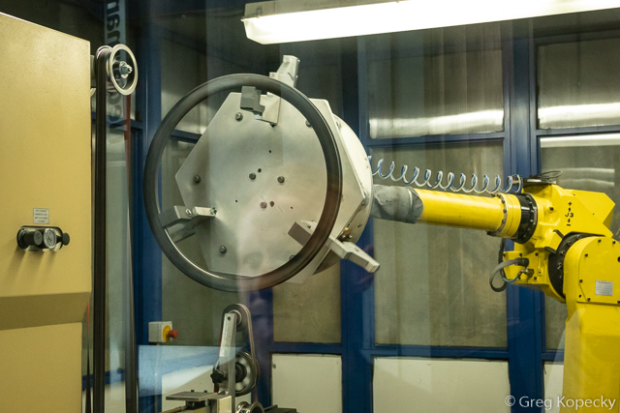 Carbon rims are finished in a different room, where this robot performs sanding duties. It picks up one rim at a time from a stack, moves it around in multiple planes to evenly sand each rim edge, and sets it down in a different stack of finished rims. This is one area where having a machine perform the task is better than human hands, as it can apply a much more exact and consistent amount of sanding (something that’s critical when considering things like the necessity for even braking surfaces on rim brake wheels).