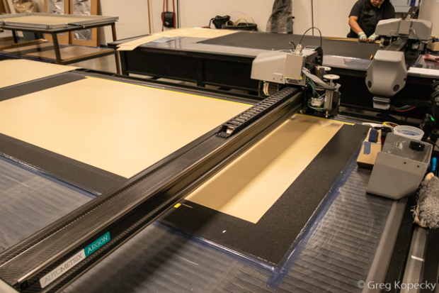 Huge rolls of carbon come out of storage in a massive walk-in freezer and into the cutting room. Here, they are hand-laid in specific orientations, to be cut in to pieces of all shapes and sizes.