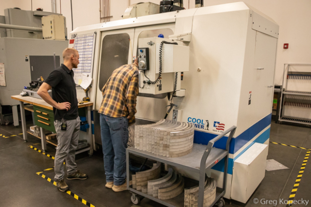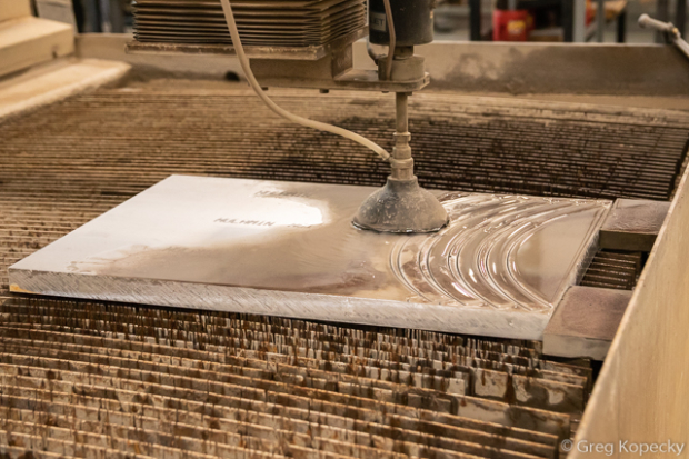 Large plates of aluminum come in – the raw material for what will become wheel molds. Here, a water jet cutter cuts out sections that will eventually be rim O.D. tooling.