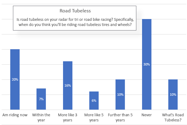 Which takes us to road tubeless. We poll on this (as we poll on just about everything), and 20 percent of you all are riding road tubeless tires now. Another 7 percent say you intend to change to road tubeless within the year. (The poll results from below were taken in June of 2019.) So, generously, rounding up, about 3 in 10 Slowtwitchers expect to ride road tubeless during the 2020 season. We have the results of what the top male pros were riding in Kona, and it’s here, on our front page. Let’s talk first about their choice of tire – yes, the brand and model, but mostly the type. Here is what the top 10 males were riding, in order of place: