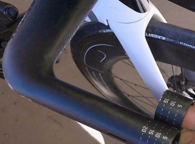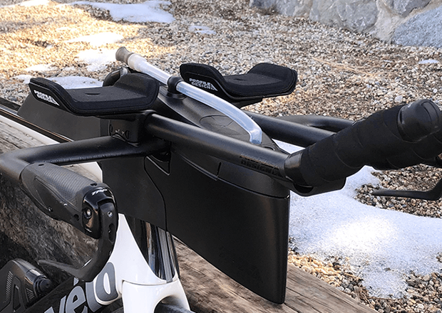 The Profile Design stem I used had a -17° pitch (extension level with the horizon). I placed 30mm of headset spacers under the stem. Why? If you look at the hydration system, it’s pretty level now with the P-Series’s top tube storage. That’s what you get with that 30mm of spacers. I need some pad height anyway, so, I’m getting the first 30mm that way, and then another 10mm or so under the pads.