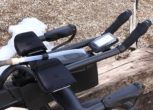 The next obvious change is the aerobar and the hydration. The bar is the Aeria Ultimate. Now, you might wonder why I’d put a bar on a bike that just got recalled. The bar on this P-Series has the replacement pursuit bar (the one that replaced the recalled bar).
