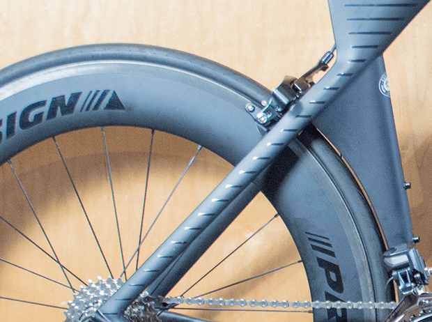 The wheels that come stock on this bike are 30mm deep and aluminum – just about as special as Clark’s chunky, black glasses. We pulled those off and put on a set of Profile Design carbon clinchers. The front wheel is Profile’s 58/Twenty Four. At just shy of 60mm deep and with only 20 bladed spokes this wheel is plenty slippery without getting tossed about in cross winds. The Rear wheel is 20mm deeper as the Profile Design 78/Twenty Four name suggests.
