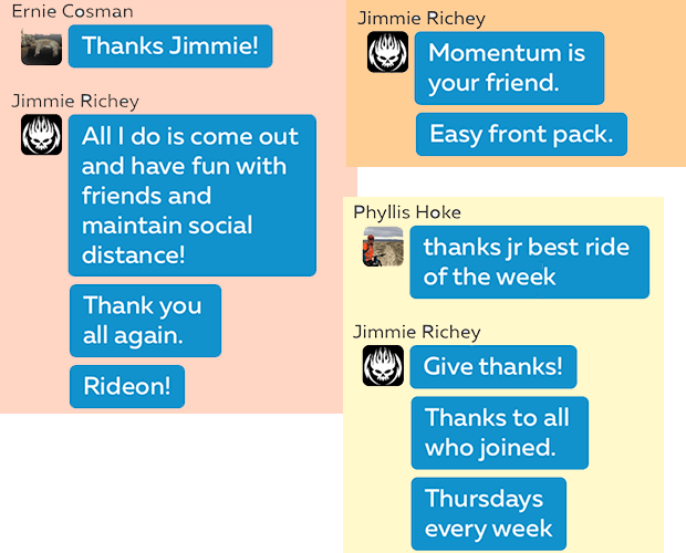 What you see here are screenshots from my iPhone of Zwift’s Companion App. It’s the only way to get a transcript of the in-game messages during a ride. It is hard to message in-game when everyone is near his or her limit trying to keep up. The easiest way to illustrate the effect of Jimmie’s leadership was to just snap some screenshots of his messaging. The volume of Jimmie's in-game message help is remarkable.
