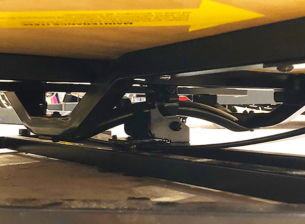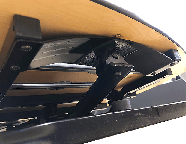 The images here show the underside and what you’re looking at are the mechanics that make the platform move. There’s a set of curved tubes front and rear and the trainer moves on these tubes via wheels. This is the fore/aft movement you sense when you’re getting in and out of the saddle and the video embedded here clearly shows this.