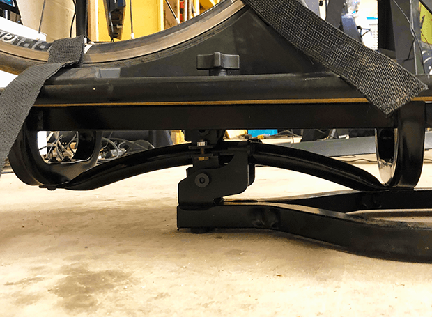 You might note that one footpod on the H3 trainer is near the edge of the platform. This is because trainers aren’t symmetrical, side-to-side. The cassette body sits out one side. When you center a trainer on the platform, one leg may sit out farther aside than the other, and that’s the case with the H3. Also, the H3 has particularly “long legs.” More so than other trainers. But the platform is perfectly stable. The bike is absolutely locked down on the platform in front, and the trainer likewise in back. Nothing is going anywhere on this platform.