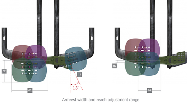 The ‘wings’ on to which the arm cradles mount may be flipped forward or backward. The mounting holes allow for a huge range of possible positions, and up-to-13 degrees of angle adjustment.