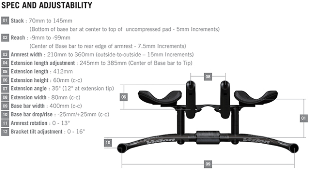The above chart shows the basic specs that you or your bike fitter will need. Quoted weight for the bar is 695 grams without armrest spacers.