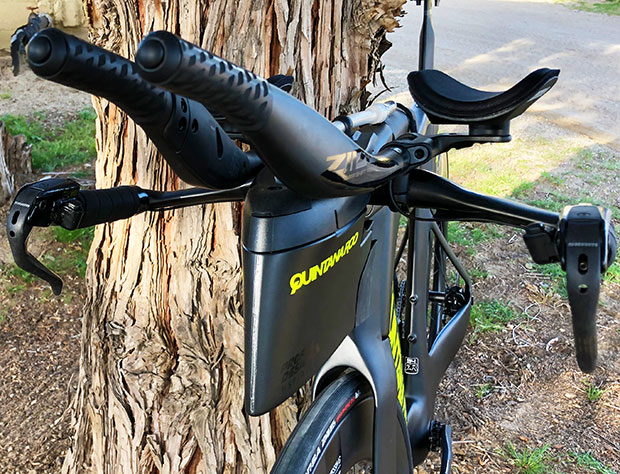 If you use Zipp’s new wireless, smart shift extensions then the shifting is entirely wireless. Nothing through the frame. No wires, junction boxes, no BlipBox, nothing. However, QR made its frames with the idea they’d be paired with Profile Design cockpits. To begin with, the PRSix2 ships with a Profile Design industry leading Aeria Hydration, which is painted by QR in Chattanooga to match the frame. When I wrote about Zipp's new electronic extensions in March, the Zipp aerobars were mounted on a Zipp pursuit bar which I’ll write about some other time. I left that pursuit bar on the bike, because I dig its cable routing options.