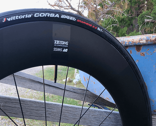 I’ve got Vittoria Corsa Speed tires on these wheels. If you’re an avid Slowtwitcher, you know I’m a big fan of road tubeless, and in particular of Schwalbe’s road tubeless. But it must be acknowledged that there are at least 2 other brands that deserve market share: Continential and Vittoria. Of the two, Vittoria is the most interesting to me because its road tubeless tires test so darned well when measuring rolling resistance. These are 25mm tires on the bike and they are the choice of some discriminating pro triathletes.