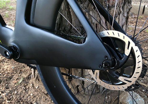 The PRSix2 frame got lighter and stiffer, by about 10 percent in each metric. And it onboarded this integrated front hydration system. Then there’s already the SHIFT tech, and you either buy this narrative or you don’t: The down tube's asymmetric shape shunts the wind to the non-drive side of the bike. One thing about that big fat off-side chain stay, it appears to have at least a fighting chance of fairing that rear brake caliper and rotor. It also stiffens the frame up nicely and that’s always an issue on aero bikes.