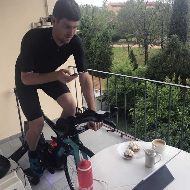 David: Well running I do some strides on the balcony. I do a lot of skipping to keep weight bearing. Cycling I have been doing 17-20 hours a week. It has moved my cycling ability on and hopefully as I reintroduce running I will be able to maintain the new cycling fitness.