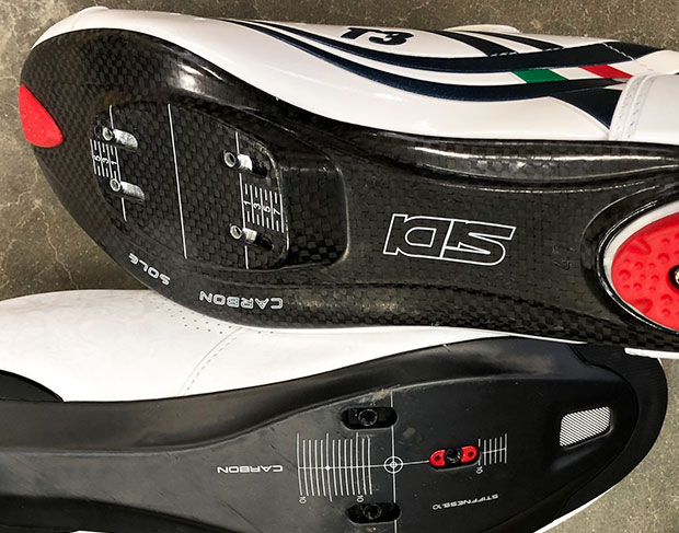 There are shoes that are Speedplay-native I guess you’d say, and above is a Sidi triathlon shoe so-constructed. You'll see its 4-bolt pattern and it's next to the Shimano RC7 that has the more typical 3-bolt mounting pattern. Note that in the Sidi shoe it's not just the bolt pattern; the sole of the shoe is built up so that the surface is flat. If your shoes don’t go into Speedplay pedals easily; if you perceive there’s any rock in the shoe when using Speedplays; it’s because the cleat isn’t mounted correctly. The Speedplay cleat must be mounted to a flat surface, not a concave surface. Hence the way this Sidi is constructed.