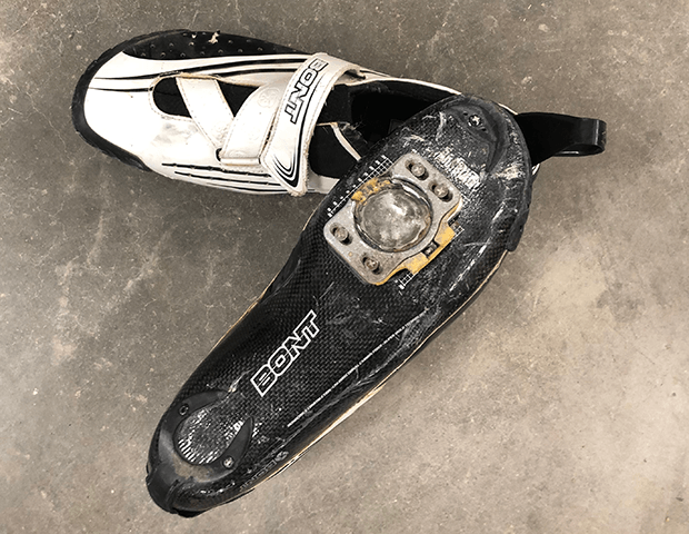 I acquired 2 new sets of shoes for this. Both are Shimano. I wanted to test both the RC9 and the RC7, to see whether the RC9 was really worth the extra money, or whether you’re fine with the RC7. I mounted the Garmins on the 9s (in the image just above) and I’m mounting the Speedplays on the 7s (in most of the other images here). It’s not that I’m made of money here. It’s that my old Bonts (in the image below) had served me well, but after 8 years of using both the Bont tri and the road shoe they finally just wore out, and there wasn’t any more use in them.