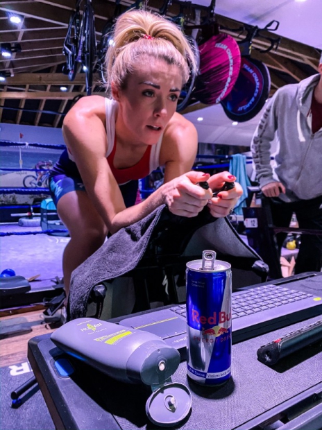 Lucy: Getting my set-up prepared usually starts with a final course check and setting up my nutrition for the race. Check my Kickr bike over to make sure everything is clean and ready to go. A quick warm up with my Theragun which I find useful for activating my glutes and quads and also lets me identify if anything is really sore or stiff so I can do some extra stretching if needed. Then it's time to apply a layer of Amp Human's PR Lotion. These races are really tough and Amp makes a big difference not just in the race to buffer lactate build up but also a massive help for recovery because I know I will be back on the start line in the TTT racing for The Choppers the next day. While the AMP is soaking in it’s time to do all the calibration checks and my official weigh in. Kit on and start my warm-up is next. I aim for 20-30 minutes with a Kickr calibration after 10 mins. Drink a can of Red Bull, set up the webcam, last minute advice from Reece and I am ready to go.