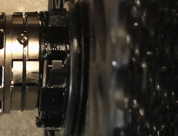 When you do take off the body driver you get a look inside at the cassette assembly. (Which is not the hub assembly.) There’s a lot of good stuff in there. What you see are larger than typical cassette body circumferences. Everything’s larger in these Zipp hubs (except for the XDR driver body, which allows for smaller, 10t, cogs). I don’t know if you can tell from the image above, but the cassette body in the middle, attached to that massive Eagle 12sp 10×50 cassette, is the one that comes on the 303 Firecrest wheel. It’s a LOT bigger than the 2 driver bodies on either side of it. The gold cassette driver is pretty industry-typical. It’s what I got from Saris when I bought an $89 driver that allowed me to put SRAM AXS cassettes on my H3 trainer.