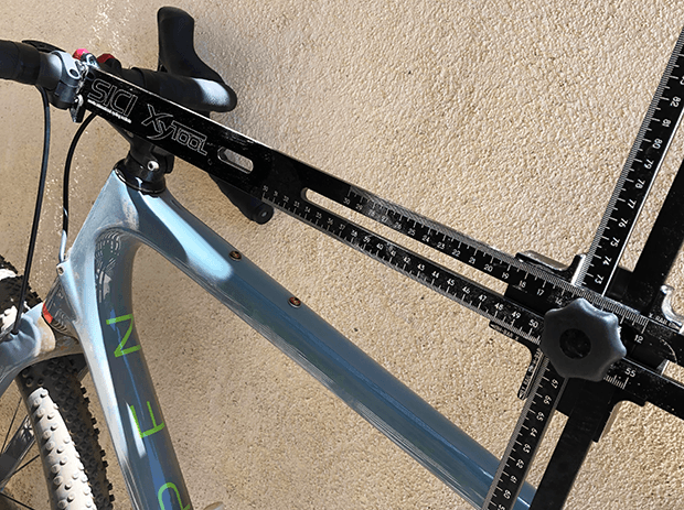 There's a number of ways to measure this. Bear in mind that this is not HX I'm measuring, which is BB-to-handlebar clamp, and one typical way to do this is to use the SICI tool, pictured above. I'm measuring past the handlebar clamp and all the way out to the Web X, which is to those Lock Laces.