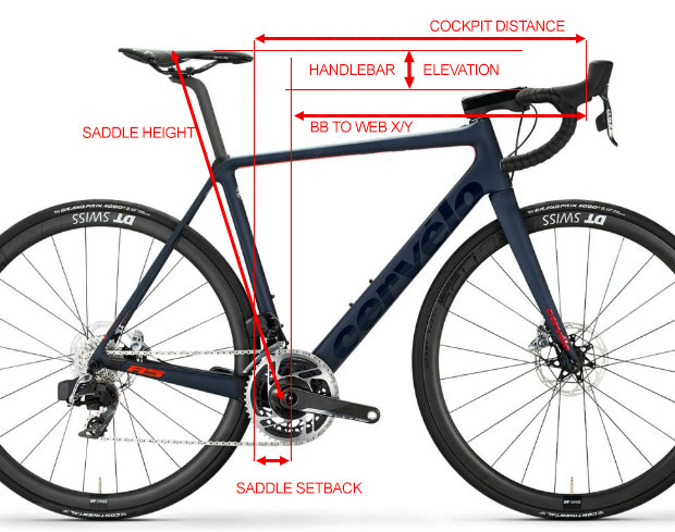 First, let me tell you what I measured (which fit coordinates). I’m using a pic of a Cervelo R5 to illustrate. I’m measuring: