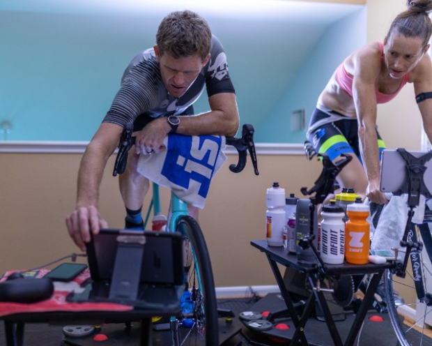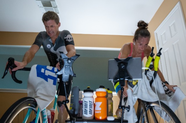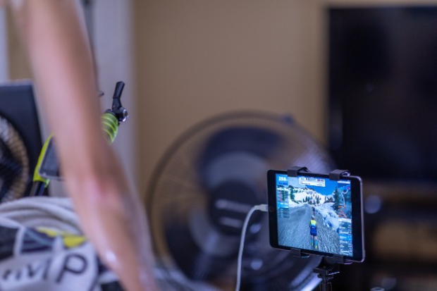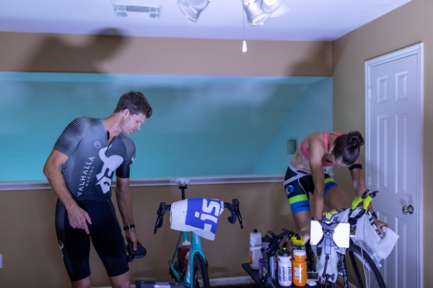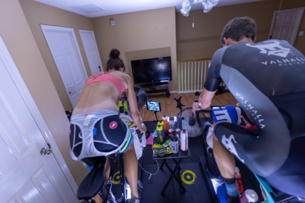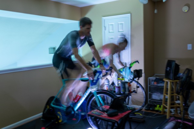 Jana and Jorge Martinez hosted the showdown at their E3 Training Solution's pain cave, complete with Saris H1 and H2 trainers, each fixed atop a homemade rocker board, enough fans to keep the room cool, a shared table to stay on top of hydration and a stable internet connection to run Zwift.