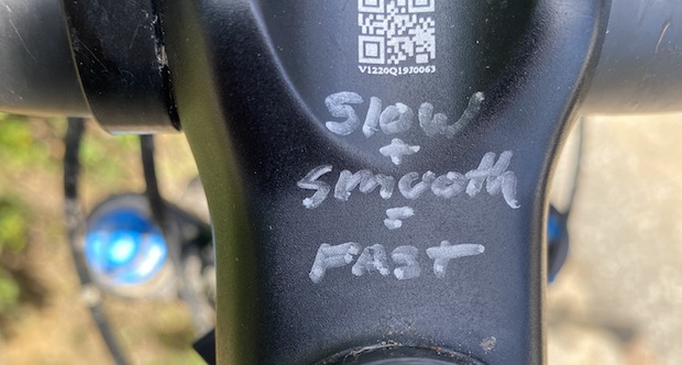 I decided I was going to drill it smooth and steady; see what happens. I wrote the phrase on my stem as if the mantra might protect me from evil spirits. “Slow is smooth, smooth is fast.”