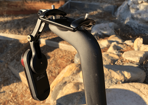 With that in mind: in the pics above and below are a pair of mounts, front and rear. They’re designed around the GoPro style. The rear mount is the hardware I’ve configured for a Garmin Varia, and it’s built into the seat post bracket hardware. My configuration is designed to go around the behind-the-saddle bag I use for spares. Cervelo designed it with this in mind.
