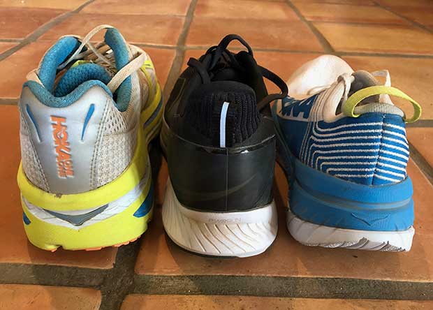 The end game – the way the designer gets the shoe to perform the way he or she wants – seems more or less the same with the Endorphin Shift and the HOKAs with which I’m familiar, but the process is different. What I want is a soft shoe up-and-down, but a firm shoe side-to-side. In other words, I want cushion, but I also want lateral support. Here is the Endorphin Shift bookended by the HOKA Bondi B (left) and HOKA Carbon X.