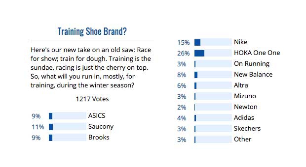 I have to really snug this shoe down to work for me, because it’s so forefoot roomy. In point of fact, it’s just a little too roomy for me (but not by much, and I have to do the same thing with my Carbon Xs). But look, while the aggregate "you" have HOKA way out in front when we ask you all what you’re training in…