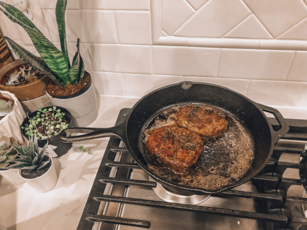 Klodian: Pan sear on cast iron, then finishes in the oven. Lots of butter. And if you think you have enough butter, you don’t, add more.